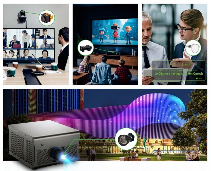 投影显示领域,联合光电自主研发的投影镜头,支持4K/8K超高清解析度,兼顾小型化与高效率设计,为激光投影、工程投影及家用投影设备提供核心光学支撑。此外,联合光电持续投入Pancake折叠光路、自由曲面、光波导等前沿技术的开发,研发并落地Micro LED Light Engine技术推动AR眼镜向更轻更薄、更接近普通眼镜外形的方向发展,为元宇宙概念落地提供坚实可靠的硬件基础。