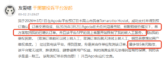 多名消费者反馈,平台单方面取消订单,无通知,无补偿;一名消费者在 Agoda 完成日本民宿预订并确认订单后,平台未作任何通知便擅自取消订单,还限制线上转人工,刻意增加用户申诉难度。平台后续推诿责任,仅愿赔付 5 美元。本月Agoda投诉回复率为0%。