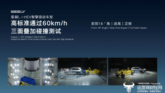 整车安全方面,为充分检验i-HEV智擎混动的安全实力,星越L i-HEV智擎混动经由中国汽研认证,在60km/h的车速下,成功通过全球首个HEV车型前部18°角偏转+后部+正侧三向叠加碰撞测试,以非常规、超标准的极限测试,全面检验i-HEV智擎混动车型的硬核安全实力。