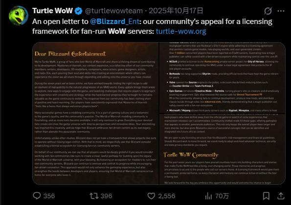 过程中不是没有过挣扎,面对暴雪的雷霆手段,乌龟服团队起初曾发布公开信,呼吁暴雪建立一种官方授权的私服许可框架,甚至表示愿意上缴利润分成以换取生存空间