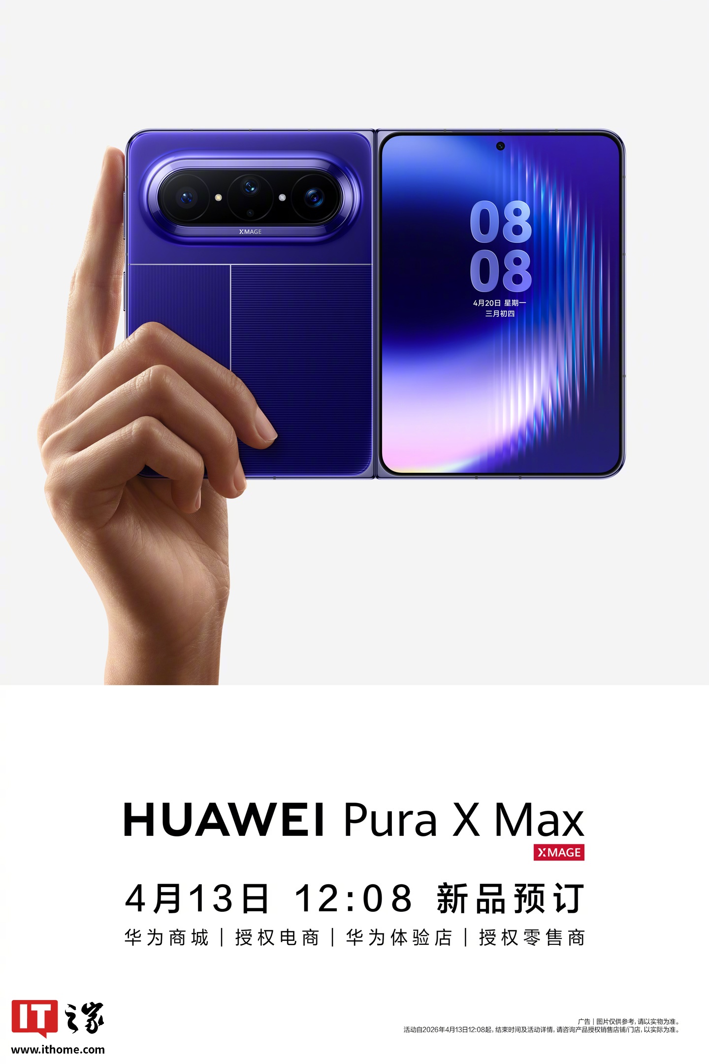 IT之家 4 月 13 日消息,行业首款横向阔折叠手机 —— 华为 Pura X Max 已于今日早些时候正式亮相并开启预订,新机还同时定档 4 月 20 日发布。