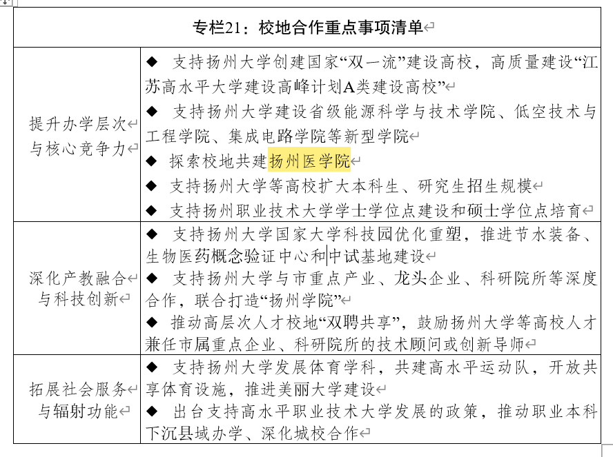 近日,扬州市政府官网发布《扬州市国民经济和社会发展第十五个五年规划纲要》。其中在“提升办学层次与核心竞争力”部分提到,将探索校地共建扬州医学院。