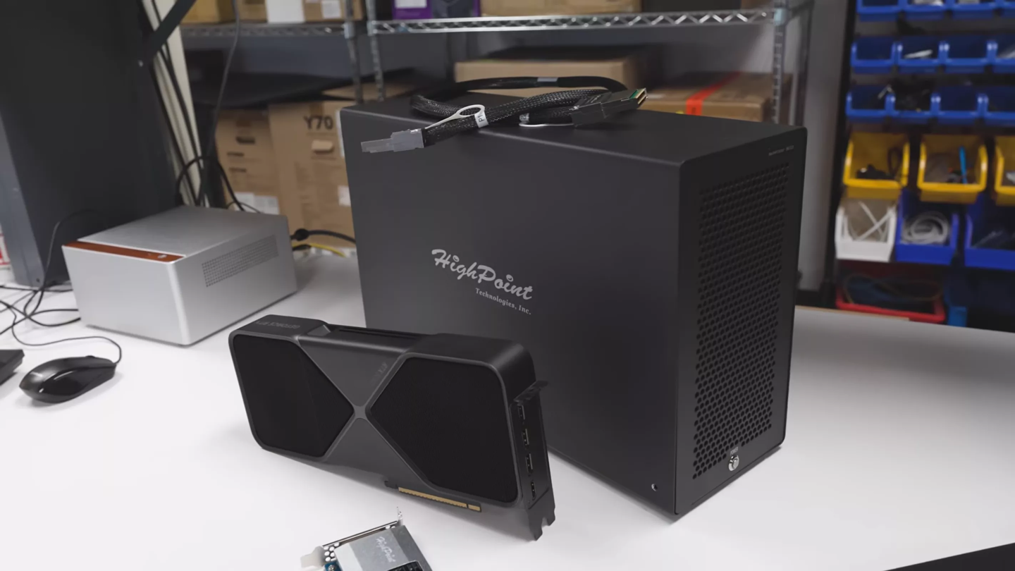 本次测试平台采用英伟达 RTX 5090 显卡,搭配 HighPoint 的专用扩展设备。硬件配置包括 RocketStor 8631D 扩展坞(售价 1300 美元)和 Rocket 7634D 转接卡(999 美元)