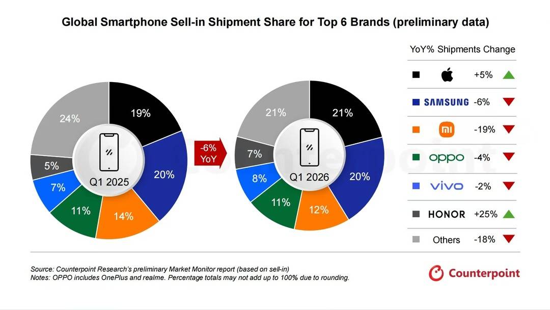 4月15日消息,据Counterpoint最新数据报告显示,2026第一季度,全球智能手机出货量同比下降6%,但荣耀、苹果增长强劲,同比增长分别为25%和5%,是头部品牌中唯二实现正增长的手机厂商。