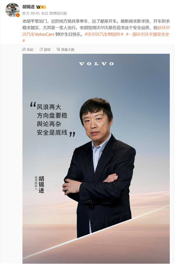 昨日,他在微博分享用车体验,为沃尔沃站台,而官方海报写着:“风浪再大,方向盘要稳;舆论再杂,安全是底线。”