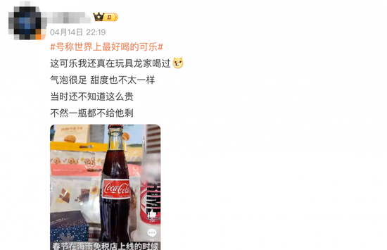 一位展台工作人员在接受三亚广播电视台《第一民生》节目采访时表示,春节期间,这款可乐在海南免税店上线的时候,当天上架就全部卖空。