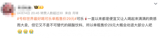 在社交平台上,就有不少网友表示,“再好喝也不配29一瓶”“可乐一直以来都是便宜又让人喝起来满满的爽感而大卖,但它又不是不可替代的碳酸饮料,所以单瓶售价29元大概会劝退大部分人吧”。