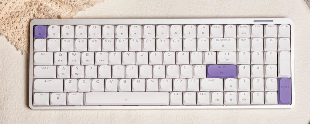 该键盘配备的线性 Mint 薄荷矮轴配备 13mm 弹簧,触发力度 38gf、触底力度 50gf,触发行程 1.2±0.4mm、总行程 3.2±0.4mm,按键寿命 20M;配套键帽为矮款 DSA 高度 ABS 材质二色注塑工艺。
