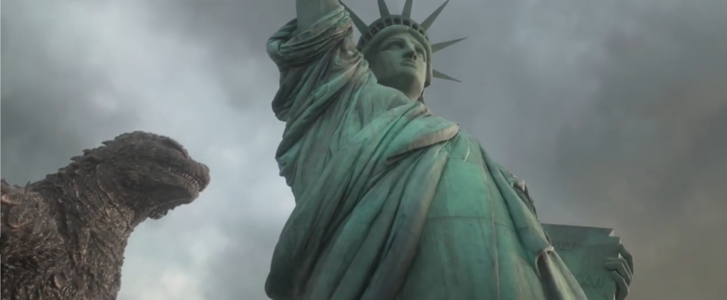 从预告可以看到,哥斯拉出现在美国纽约,与自由女神像同框