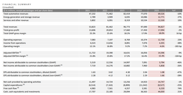 去年也就是 2025 年,虽然 Model Y 依旧是全球范围内卖得最好的单一车型,但从财报数据上看,去年却是特斯拉近来过得最惨的一年。
