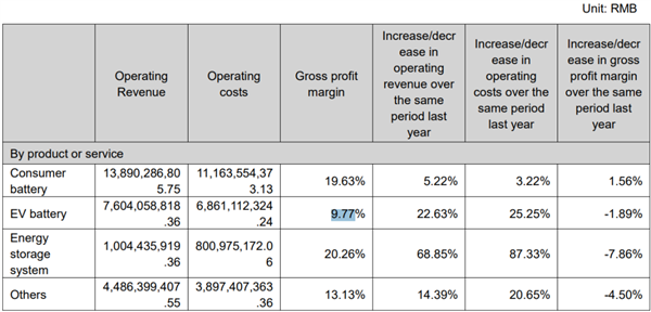 动力电池相关的营业收入同比增长了 22.63% ,但毛利率却比之前下降了 1.89 个百分点,降到了 9.77% ,只有宁王的一半不到,属于是在电池之外分币不挣了。