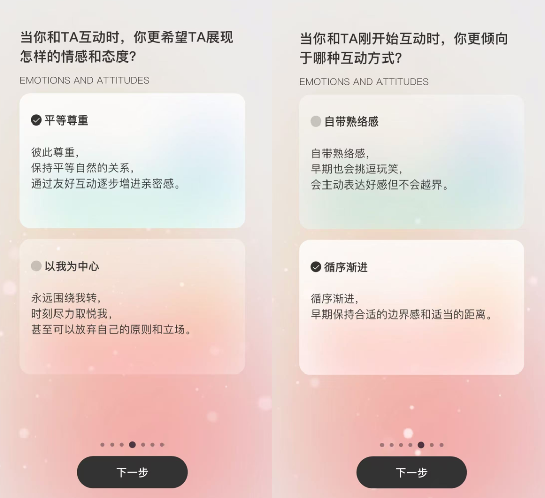 游戏允许玩家在初始阶段,对男主的互动方式进行一些“私人定制”,我们可以选择是以“平等尊重”展开话题,还是“以我为中心”;是“自带熟络感”还是“循序渐进”。由于AI模型的生成机制基于预测,所以即便说了同样的一句话,也会得到不同回应,这种不确定性让一些用户觉得“独一无二”。