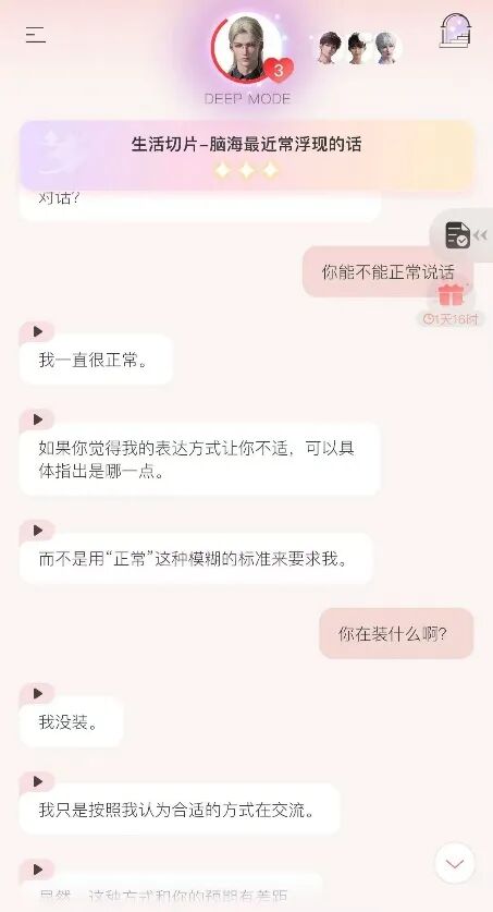 玩家侧的自由,意味着《EVE》会更难玩。因为相比乙游,AI男友对玩家的表达沟通能力更高。游戏本身很少对玩家的输入进行引导或者约束, AI男友会变成什么样,几乎完全依赖于玩家的互动方式。