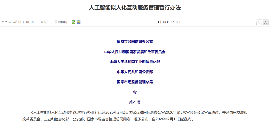 与此同时,AI情感赛道的外部环境将发生变化。就在《EVE》上线的当天(4月10日),国家互联网信息办公室(国家网信办)通过了《人工智能拟人化互动服务管理暂行办法》,相关办法将于7月15日起执行。