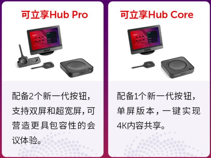 针对企业会议室规模多样、功能需求差异化的特点,可立享Hub采用灵活可定制的模块化架构,推出可立享Hub Core与可立享Hub Pro两款核心产品,精准覆盖小型洽谈室、标准会议室、大型多功能会议室等全场景需求,为企业提供“按需配置、灵活拓展”的高效解决方案。