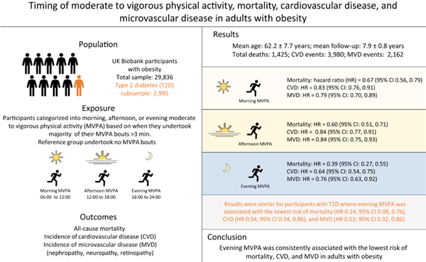 并且,运动强度和运动量也会对不同时间点的运动风险产生影响。有研究发现,对于肥胖患者以及合并 2 型糖尿病的肥胖患者来说,选择晚上进行中高强度有氧运动发生心血管疾病的风险最低。