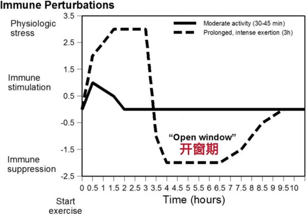 《体育科学杂志》(Journal of Sports Sciences )上发表的一项研究显示,适度运动(实线)30~45 分钟,免疫反应会持续增加;但持续高强度运动(虚线)超过 3 小时,免疫反应在短暂增强后,会开始走下坡路,超过 3.5 小时,则会诱发免疫抑制,也就是免疫系统此时可能会进入“开窗期”。