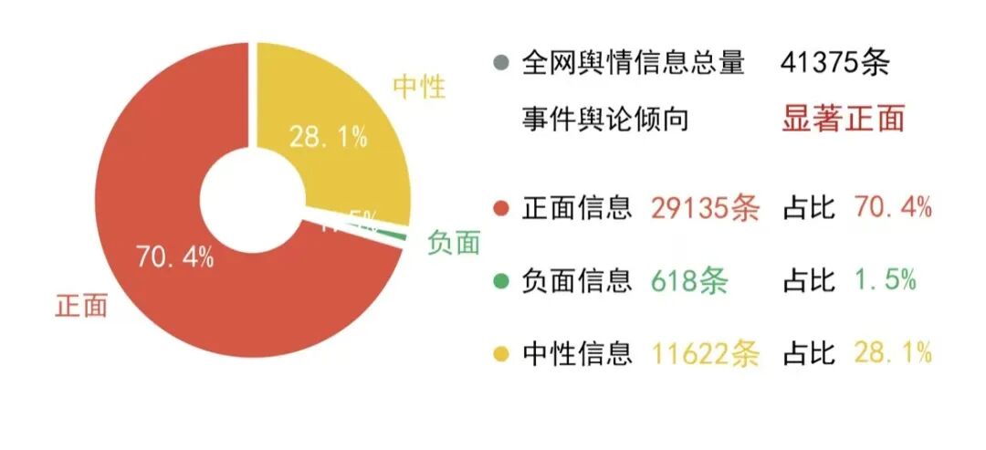 截止4月16日,此事件匹配的到全网舆情信息总量为 41375条 ,正面信息 29135条 ,占比 70.4% ,负面信息 618条 ,占比 1.5% ,中性信息 11622条 ,占比 28.1% , 事件舆论呈现出较为显著正面的倾向 。