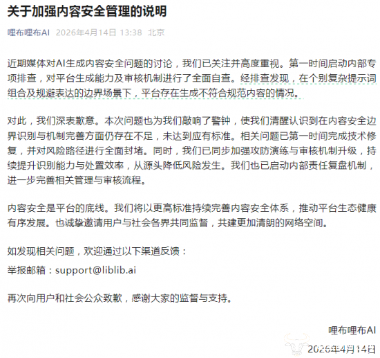 在央视曝光两天后,哩布哩布AI发布声明,承认平台存在生成不符合规范内容的情况,并表示已第一时间完成技术修复、封堵风险路径。其响应速度算不上“第一时间”,但认错态度还是很端正的。