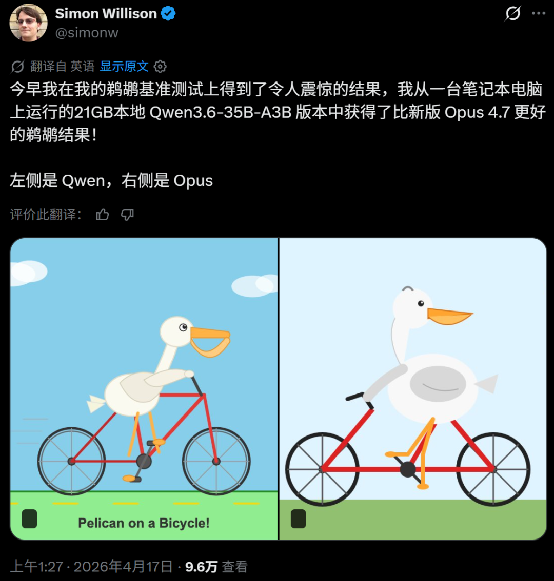 同样是在昨天晚上,千问开源了 Qwen3.6-35B-A3B(350 亿参数,激活 30 亿),有人还表示,在自己 MacBook Pro M5 上通过 LM Studio(以及 llm-lmstudio 插件)运行的千问模型生成 「 鹈鹕骑自行车 」 效果要比 Opus 4.7 好。