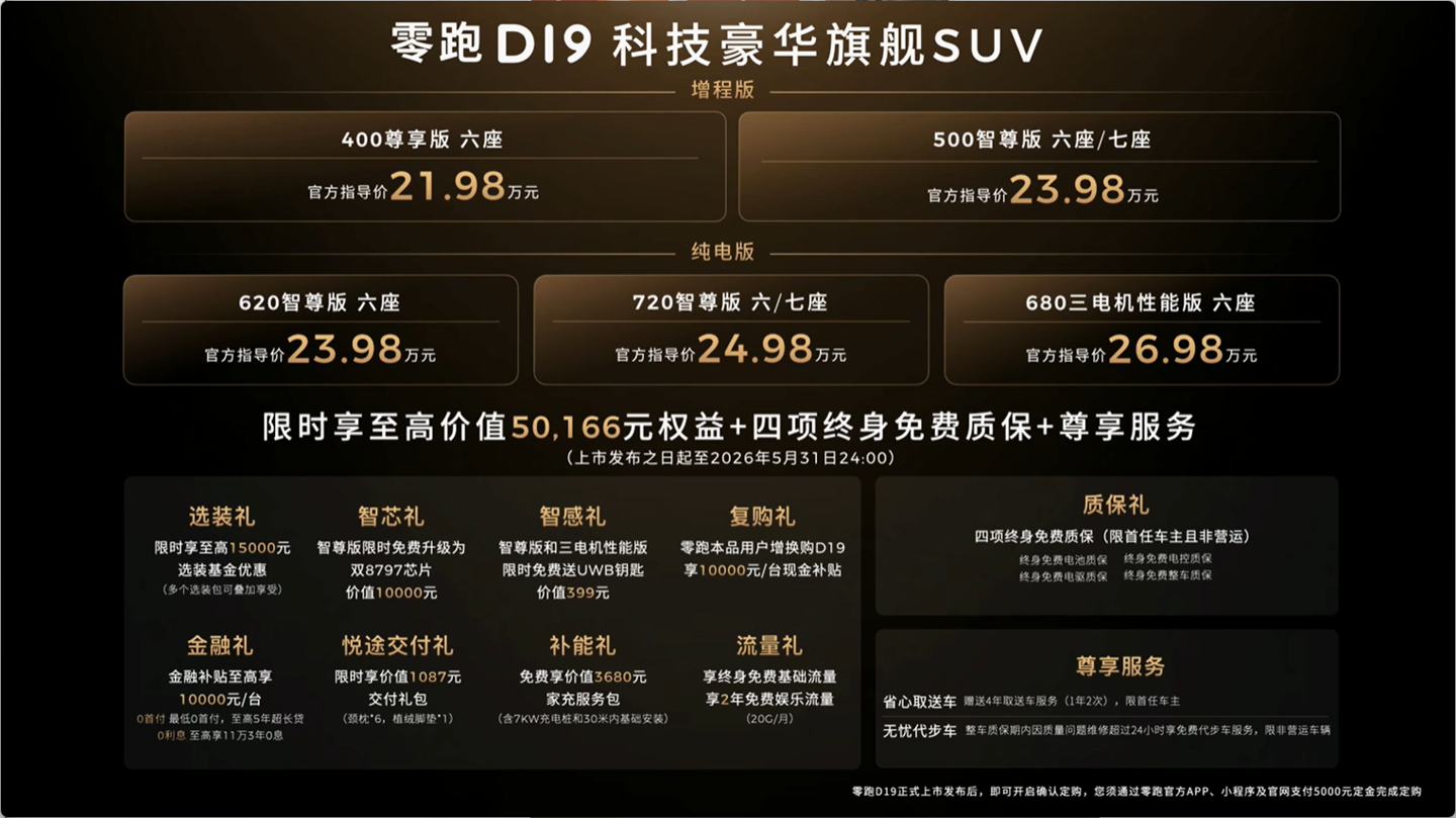 据IT之家了解,零跑 D19 提供 7 款不同配置,官方指导价格区间为 21.98-26.98 万元。作为品牌旗舰级产品,D19 基于 LEAP 4.0 技术架构打造,定位大型 SUV,提供 6 座与 7 座两种空间布局。