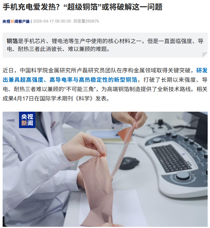 IT之家 4 月 17 日消息,据央视新闻报道,近日,中国科学院金属研究所卢磊研究员团队在序构金属领域取得关键突破,研发出兼具超高强度、高导电率与高热稳定性的新型铜箔,打破了长期以来强度、导电、耐热三者难以兼顾的“不可能三角”,为高端铜箔制造提供了全新技术路线。相关成果 4 月 17 日在国际学术期刊《科学》发表。