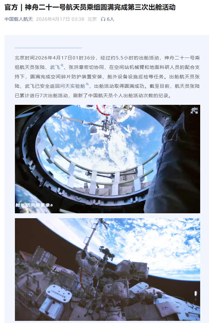 IT之家 4 月 17 日消息,据中国载人航天工程办公室,北京时间 2026 年 4 月 17 日 01 时 36 分,经过约 5.5 小时的出舱活动,神舟二十一号乘组航天员张陆、武飞、张洪章密切协同,在空间站机械臂和地面科研人员的配合支持下,圆满完成空间碎片防护装置安装、舱外设备设施巡检等任务。