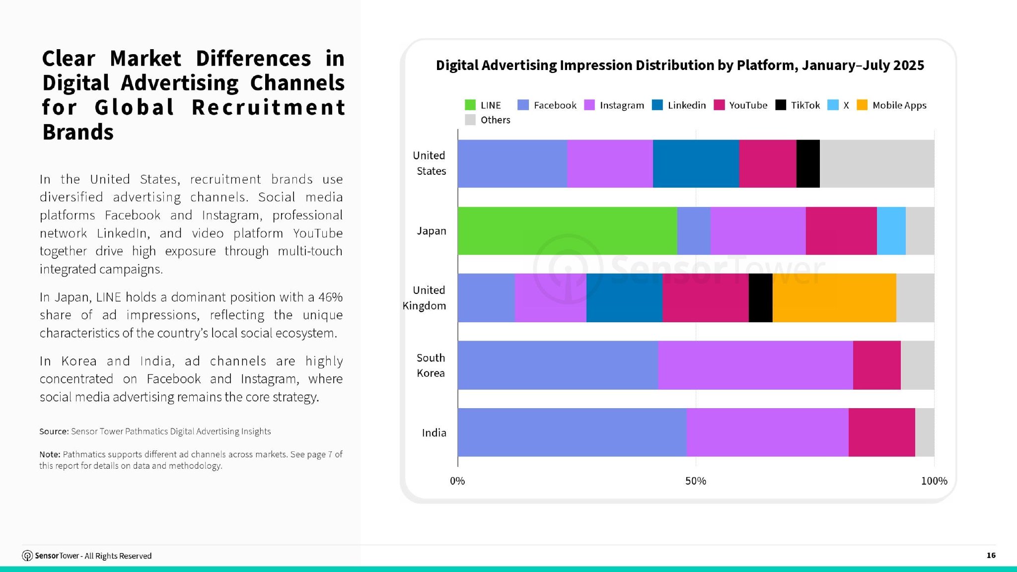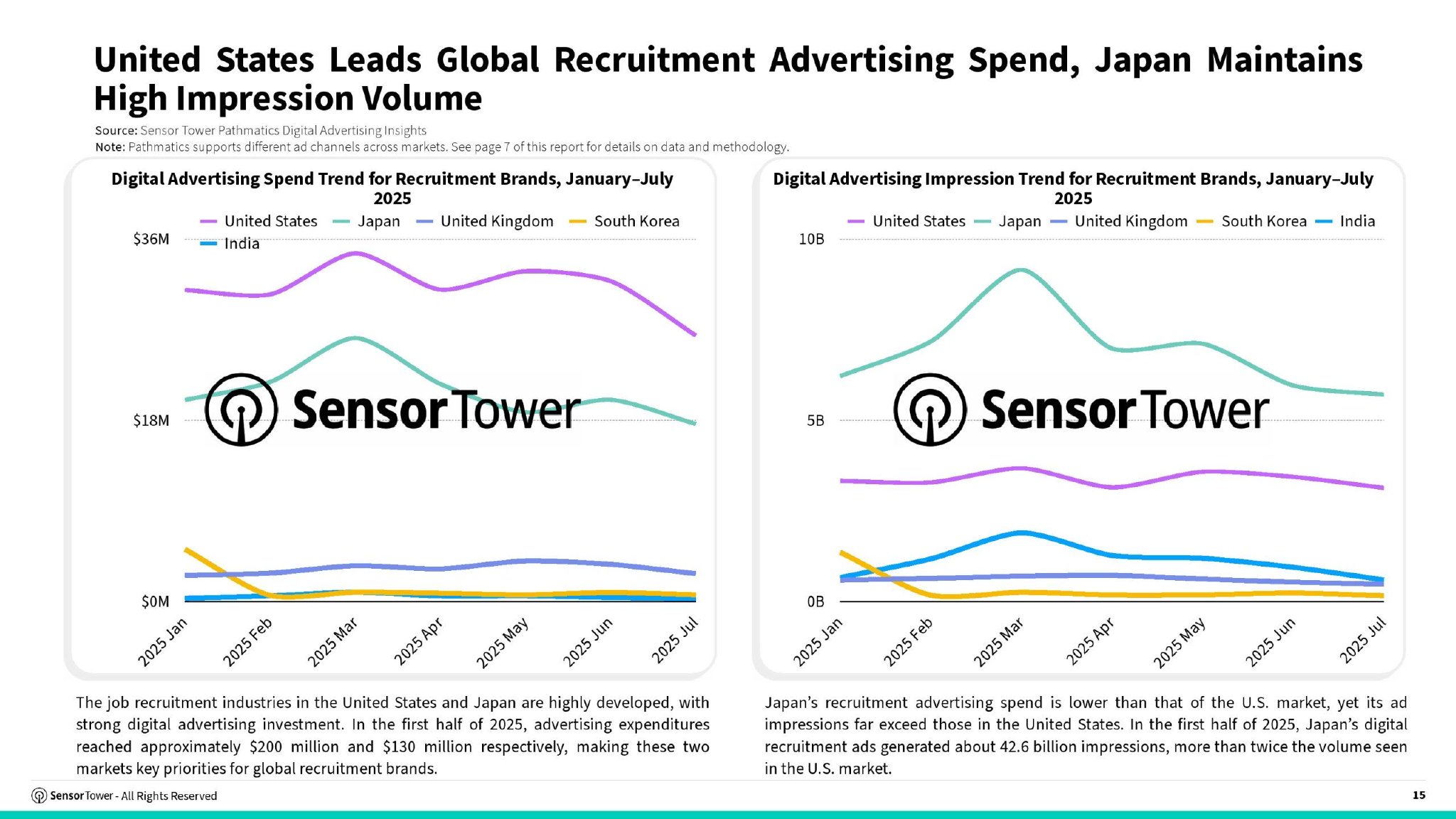 美日领跑全球招聘广告投放美国与日本的招聘行业高度成熟,数字广告投入规模显著。2025年上半年,其广告支出分别达到约2亿美元与1.3亿美元,成为全球招聘品牌的主要投放阵地。