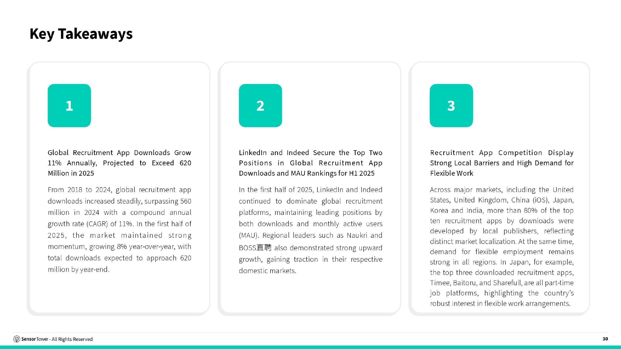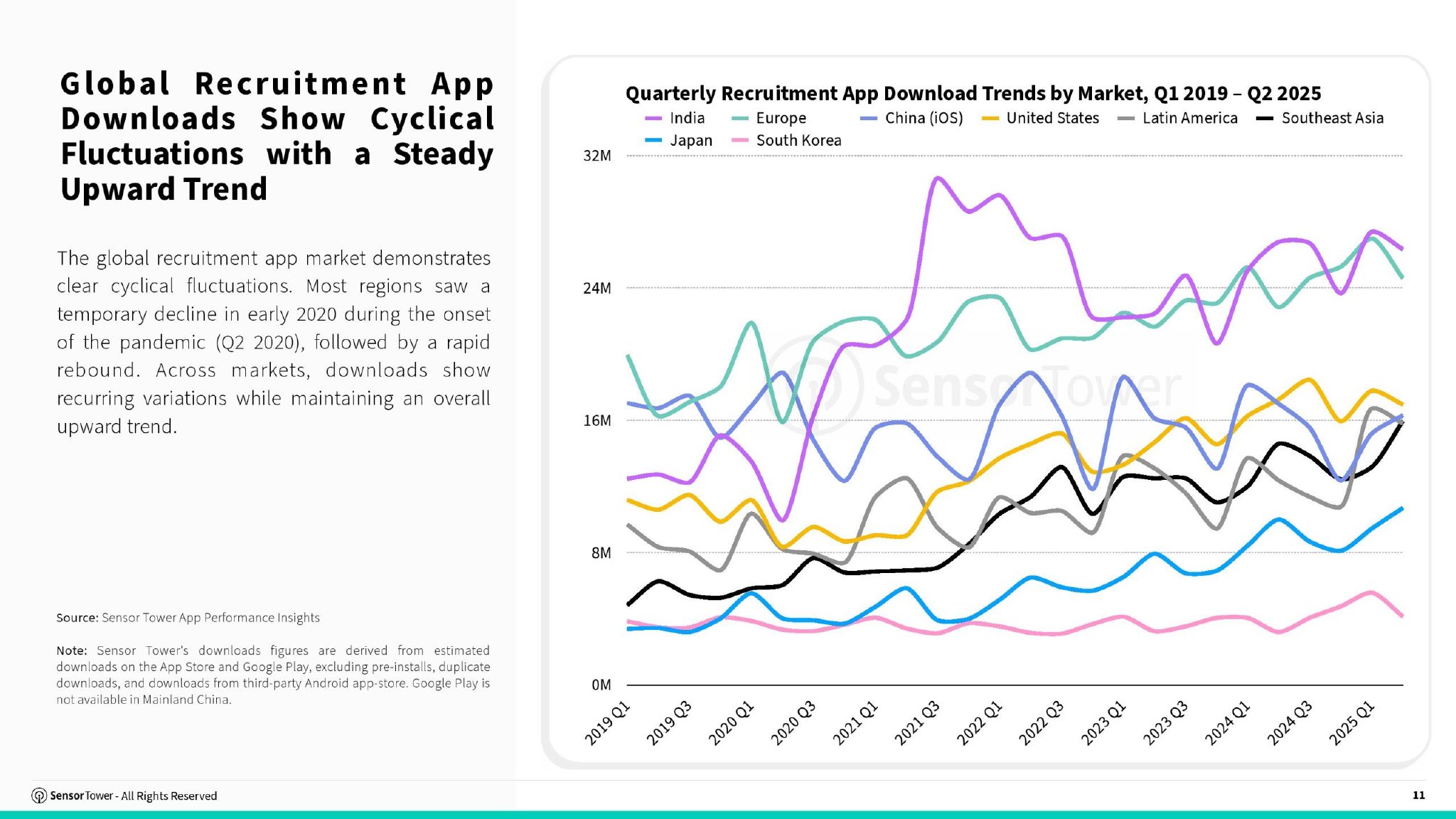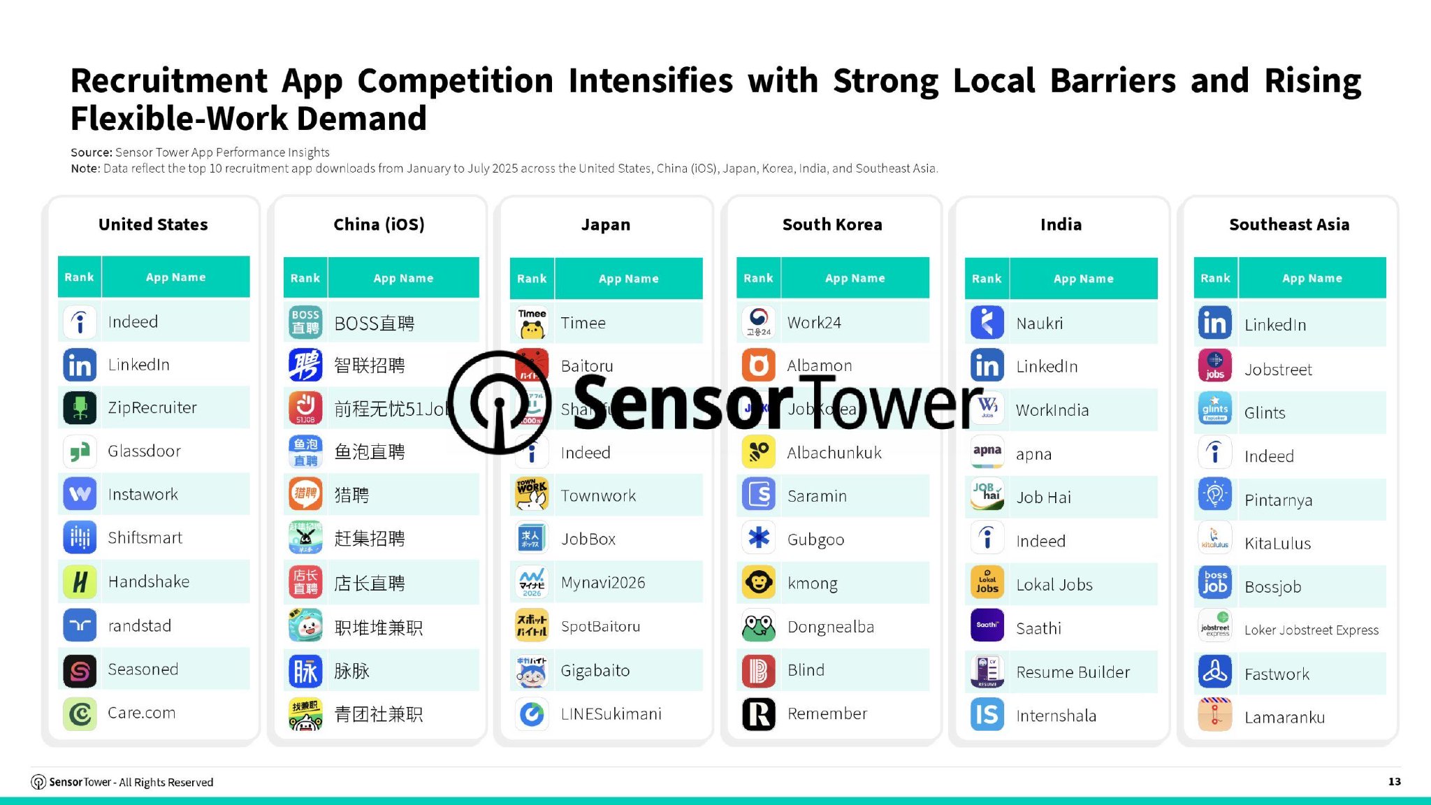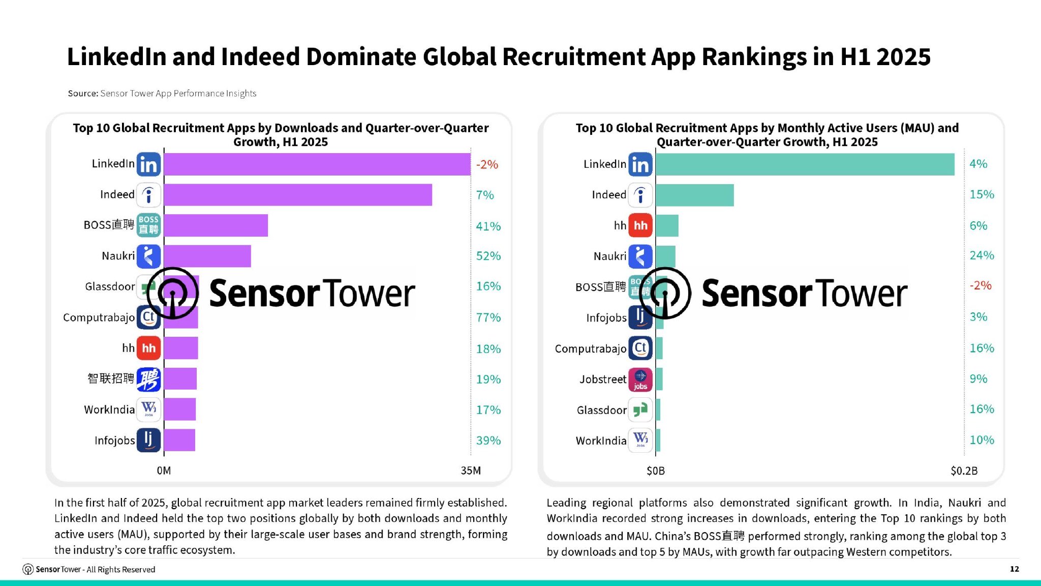 本报告基于Sensor Tower App IQ:求职与招聘数据及Pathmatics广告情报,全面分析了全球及亚太重点市场招聘应用趋势,并深入考察了招聘品牌的广告渠道、投放策略及创意方向的最新动态。
