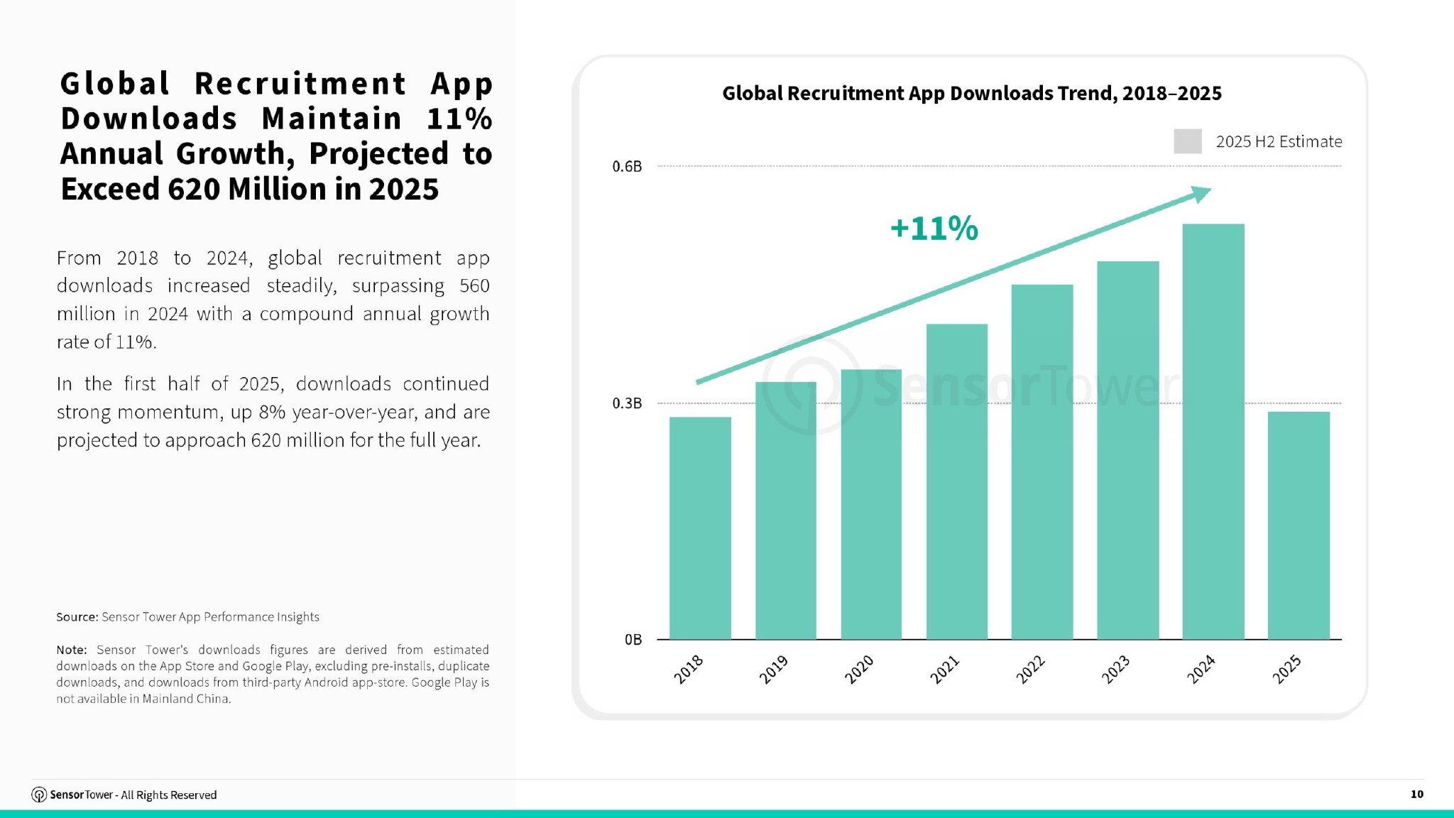 全球招聘应用下载量年增长11%2018年至2024年,全球招聘应用下载量稳步攀升,2024年突破5.6亿次,年复合增长率达11%。2025年上半年下载量保持强劲增长,同比增长8%,全年总下载量预计将接近6.2亿次。