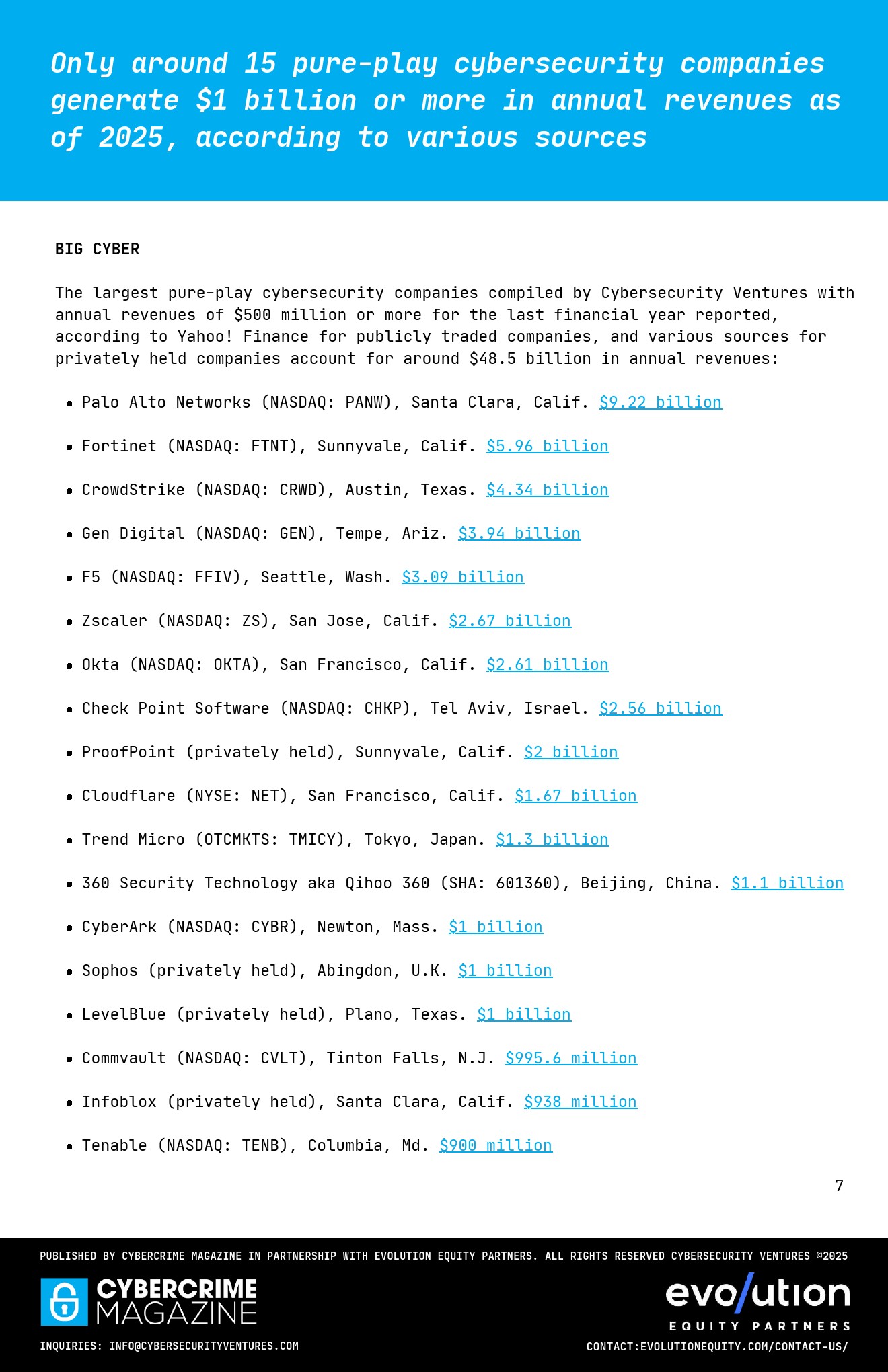 供给侧呈现高度集中与长尾并存格局。微软2025年安全收入约370亿美元,占总收入14%,头部科技公司持续加码投资。 但纯网络安全公司中,仅约15家年收入超过10亿美元,行业整体仍高度分散,同时前50家上市公司市值已超过7000亿美元。