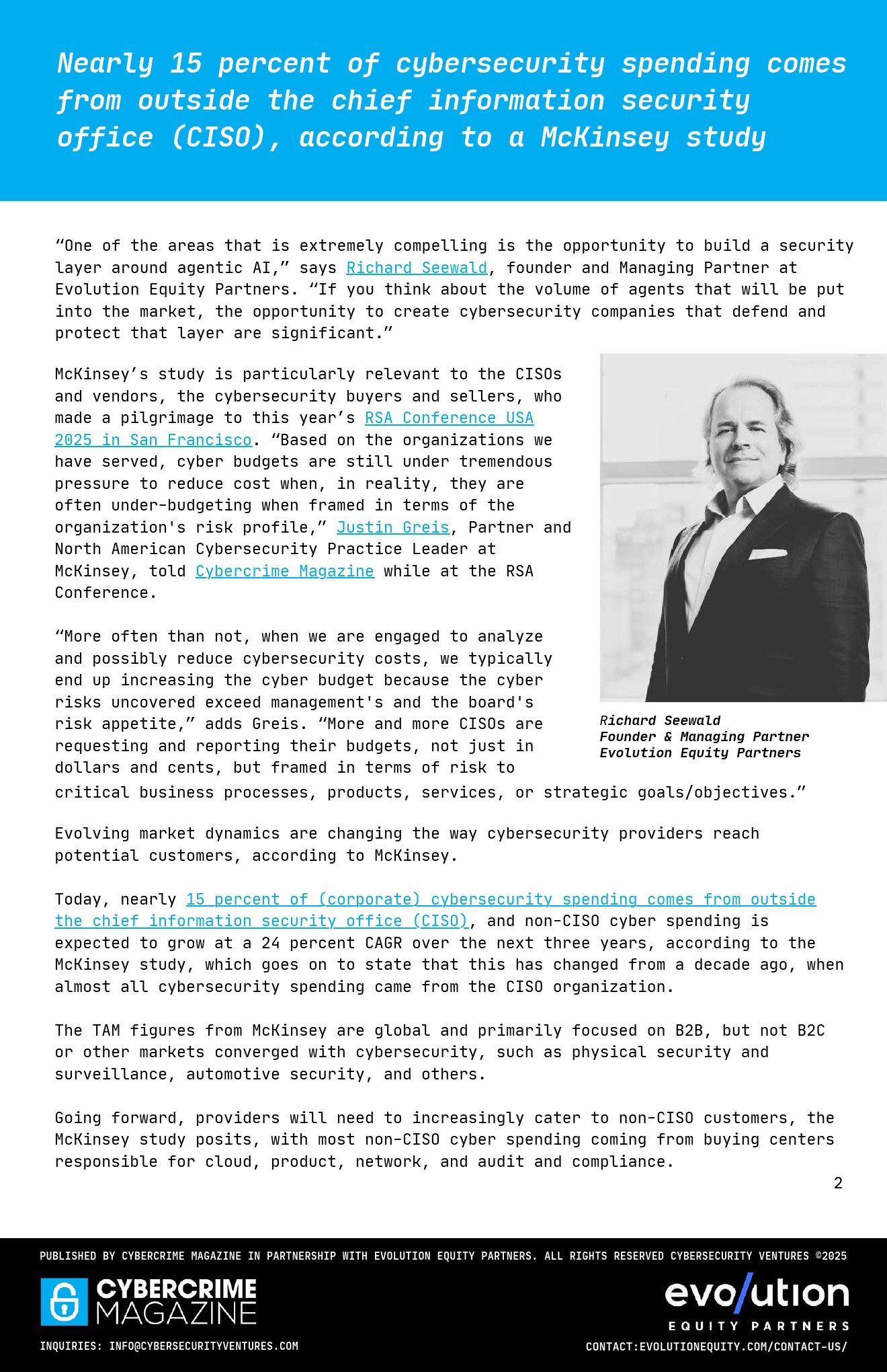 从需求结构看,市场边界持续扩展。麦肯锡测算网络安全总可服务市场已达2万亿美元规模,其中AI成为关键催化剂。企业预算逻辑也发生变化,约15%的安全支出已脱离CISO体系,且非CISO支出未来三年复合增速高达24%,反映安全决策权正向业务、云与合规部门分散。