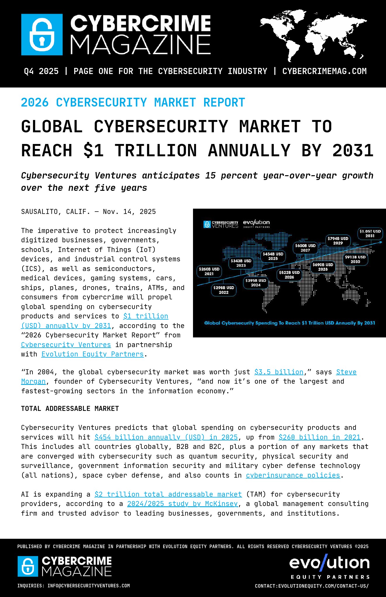 全球网络安全市场正进入指数级扩张阶段。报告显示,2021年至2025年市场规模由2600亿美元增至4540亿美元,并预计到2031年突破1万亿美元,未来五年复合增速约15%。 这一增长不仅覆盖传统IT安全,还延伸至物联网、工业控制系统及军事防御等更广泛场景,标志着网络安全从单一技术领域演变为基础性经济支柱。