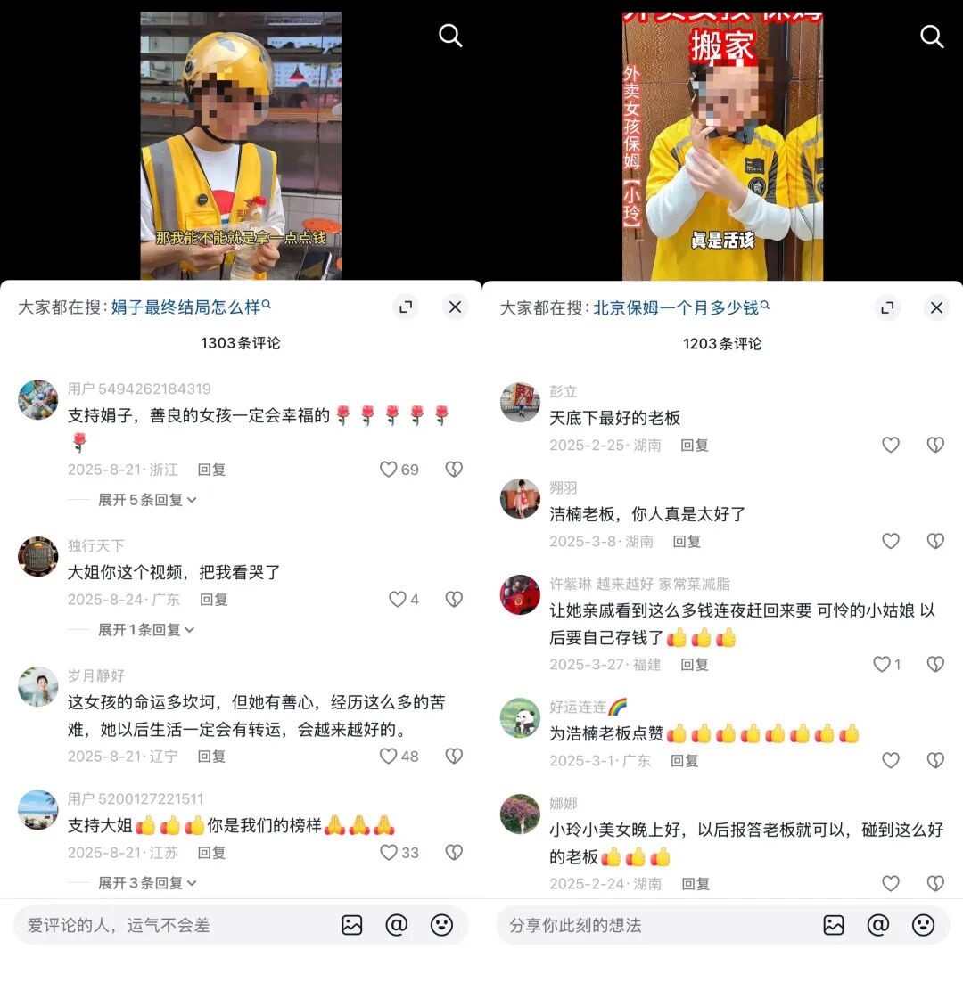 其中,一个名为“娟子”的账号,自去年 7 月起发布“连续剧式”情节,包括“寻找 20 多年未见的女儿竟然怀孕的外卖员”和“丈夫见义勇为牺牲,妻子怀孕送外卖维持生计”等。另一个名为“香港浩南”的账号,则自去年 1 月开始,打造“香港彭氏集团老板”的人设,视频情节多为“除夕前夜外卖女孩无家可归”、“带 20 岁外卖女孩回家做保姆”、“老板爱上保姆”等。