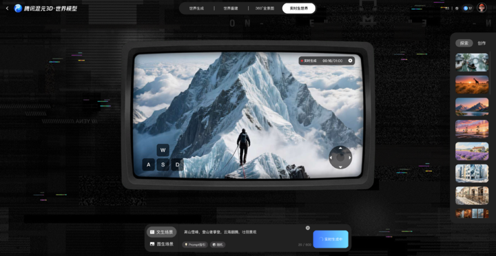 实时生世界时,我们能直接控制角色的行动,混元 3D 模型会自动生成对应的世界,单次生成的时长是一分钟。