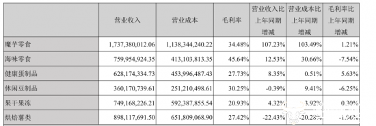 而盐津铺子全年营业收入同比增长8.64%至57.62亿元,其中魔芋零食收入由上年同期的8.38亿元增至17.37亿元,大幅增长了107.23%,成功超越烘焙薯类,成为公司的第一大单品。