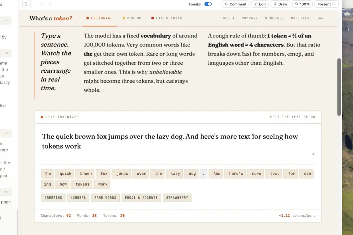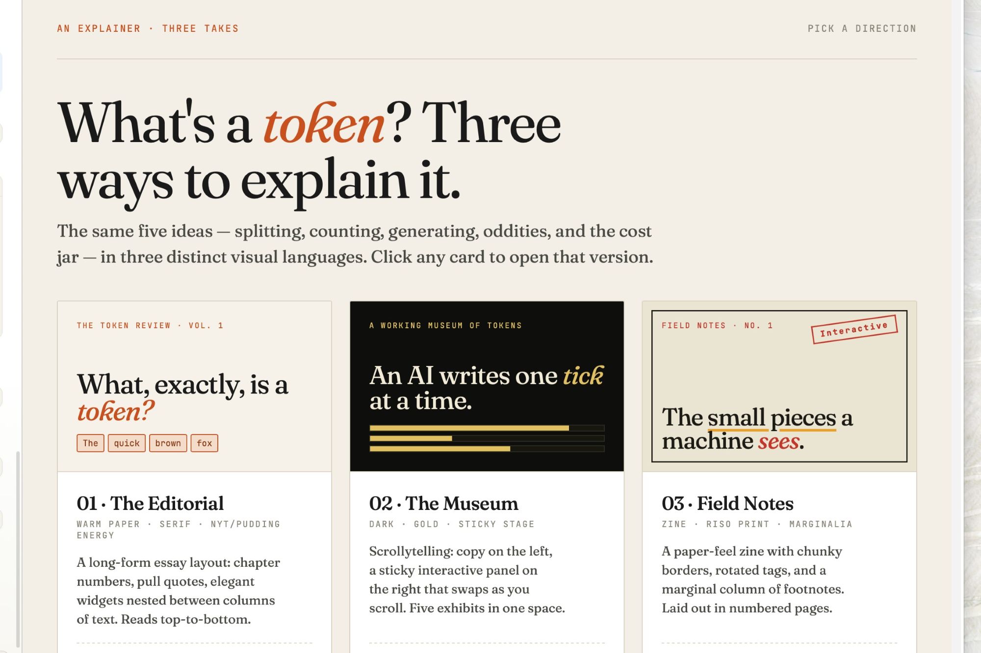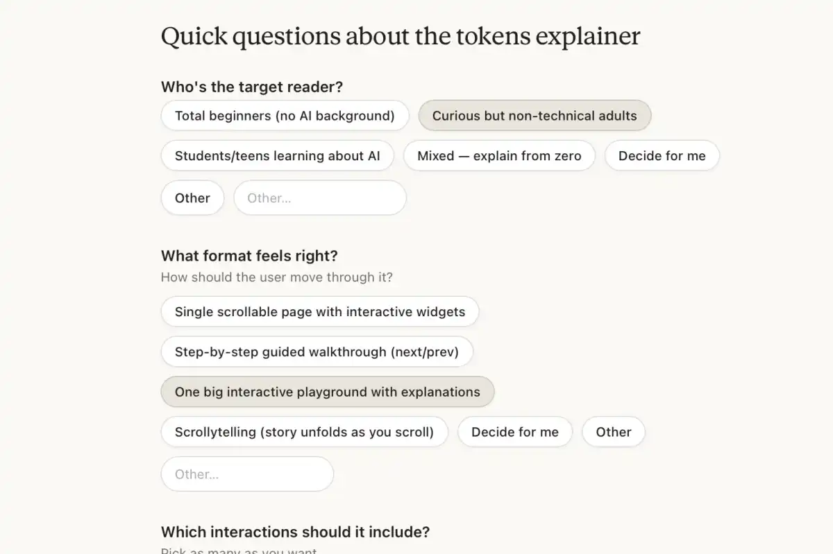 该媒体编辑本 · 帕特森(Ben Patterson)输入“创建解释 AI Token 的交互图表”提示,Claude Design 通过多轮问答明确需求,制定了编辑风格的设计方案。