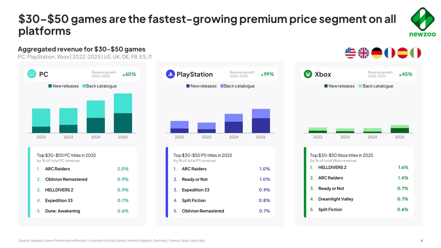市场研究机构 Newzoo 发布的《2026 年 PC 与主机游戏报告》,统计了 PC、PlayStation、Xbox 三大主流平台的游戏销量。近期平台的大部分营收都来自定价 30 至 50 美元的游戏,这一价位段也成为增长最快的细分领域。