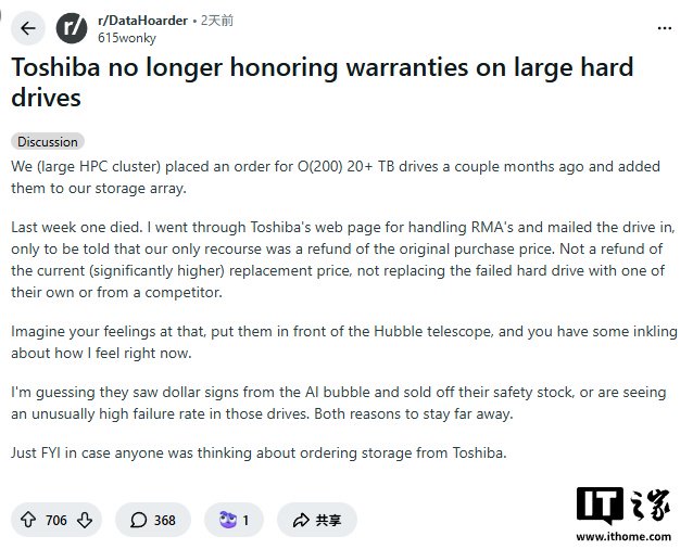 据该用户称,他所在公司数月前为其存储阵列购买了多块 20TB 以上的硬盘。其中一块出现故障后,他们将硬盘退回东芝,却被告知仅支持按原价退款。然而,这款硬盘现在已经大幅涨价,这意味着该公司必须以更高的价格购买新硬盘。