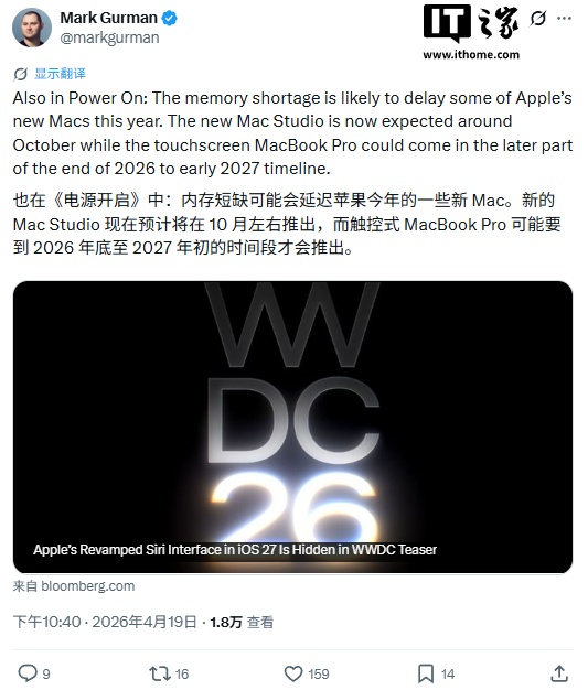 与此同时,受全行业内存短缺影响,苹果两款备受期待的 Mac 新品 —— 新款 Mac Studio 和搭载触控屏的 MacBook Pro—— 可能面临推迟。