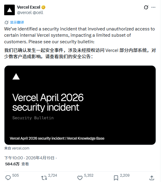Vercel 在社交平台 X 上发布公告证实发生了一起安全事件,仅影响其少量客户。该公司表示,此次攻击是通过一款遭入侵的第三方 AI 工具实施的,但未披露具体涉及哪家第三方厂商。