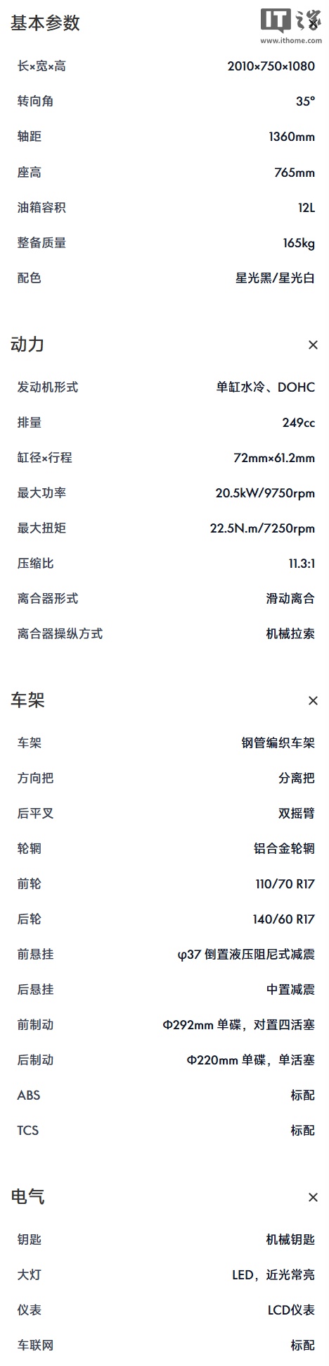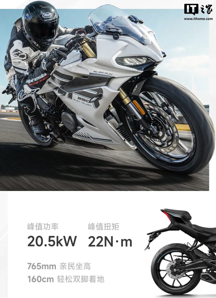 该车搭载 249cc 单缸水冷发动机,峰值功率 20.5kW,峰值扭矩 22N·m,整备质量 165kg。