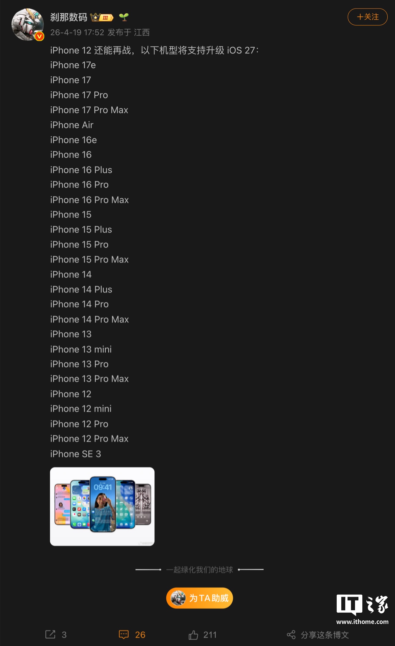 IT之家 4 月 20 日消息,博主 @刹那数码 发文,透露苹果 iOS 27 将不再支持 iPhone 11 / Pro / Max 及 iPhone SE 2,而“iPhone 12 还能再战”。