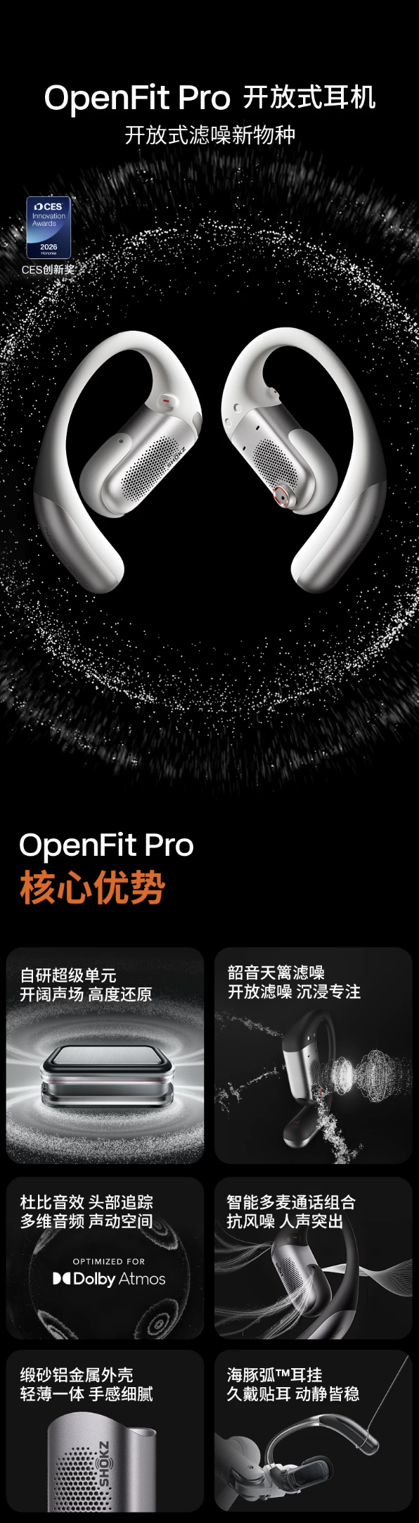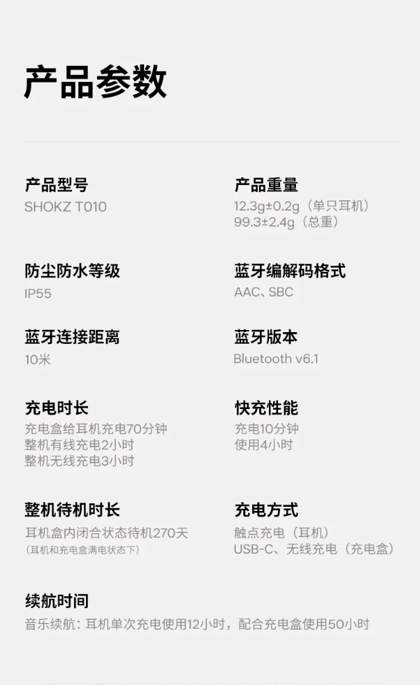 该耳机搭载同向双振膜超级单元结构,匹配海豚弧耳挂,支持六麦克风收音 + AI 通话降噪 + 抗风噪通话,耳机匹配蓝牙 6.0 技术,内置电池提供至高 12 小时续航,在配合充电盒的情况下至高提供 50 小时续航。