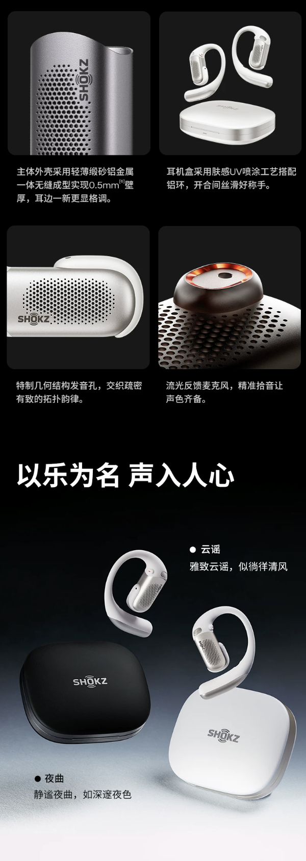 该耳机可选云谣、夜曲两种配色,其采用锻砂铝金属外壳,提供 IP55 认证,耳机配有实体按键便于操作。