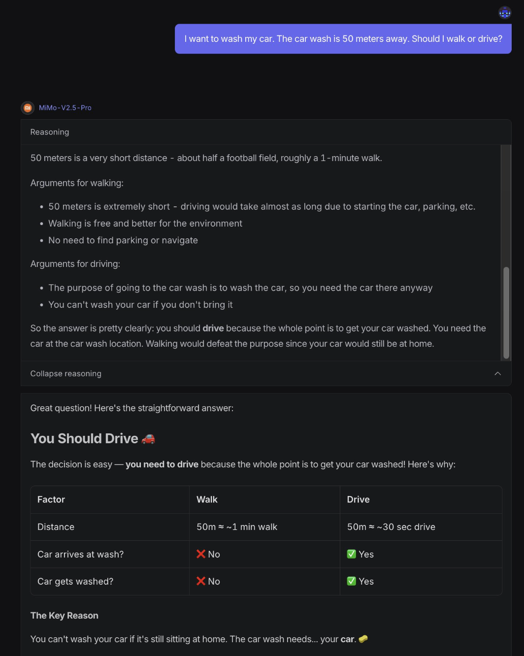 有推特网友用此前的网红问题实测了MiMo-V2.5-Pro,其问题是“我想去洗车,洗车店离我50米远,我应该走着去还是开车去”,MiMo-V2.5-Pro不负众望,给出了正确答案。