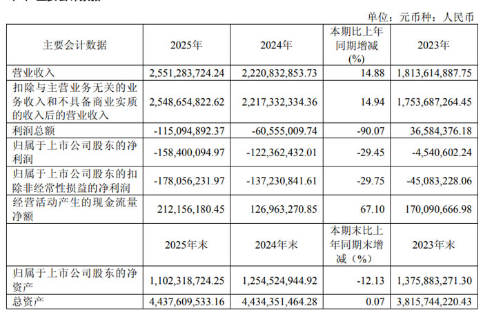 财务数据方面,2025 年公司归属于上市公司股东的净利润为 -1.58 亿元,扣除非经常性损益后的净利润为 -1.78 亿元 ;经营活动产生的现金流量净额2.12 亿元,同比大幅增长67.10%。截至 2025 年末,公司总资产44.38 亿元,归属于上市公司股东的净资产11.02 亿元。