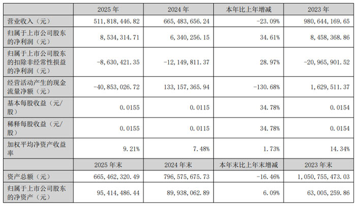 截至 2025 年末,公司资产总额6.65 亿元,归属于上市公司股东的净资产9541.45 万元。