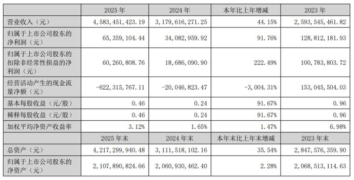 2026 年 4 月 23 日,深圳市亿道信息股份有限公司(股票简称:亿道信息,股票代码:001314)正式发布 2025 年年度报告。报告显示,受益于 AI 技术赋能、消费电子行业复苏及公司 “AI+” 战略深化推进,亿道信息 2025 年经营业绩实现大幅增长,全年营业收入达45.83 亿元,同比增长 44.15%;归属于上市公司股东的净利润0.65 亿元,同比增长 91.76%;扣除非经常性损益后的净利润0.60 亿元,同比大增 222.49%,经营质量与规模同步提升。