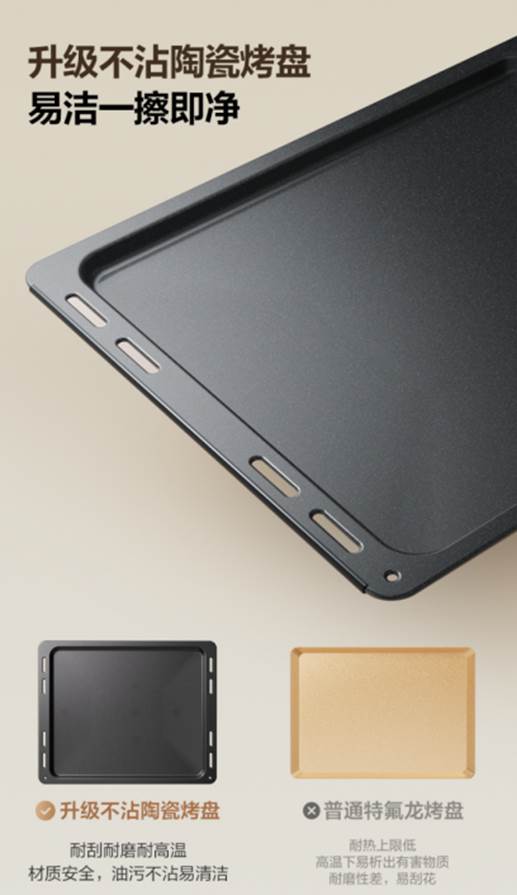 1、美的P40pro三代:内胆采用四面雪花搪瓷,光滑不沾油,一擦即净。烤盘为升级版不沾陶瓷烤盘,同样一擦即净,清洁非常省心。